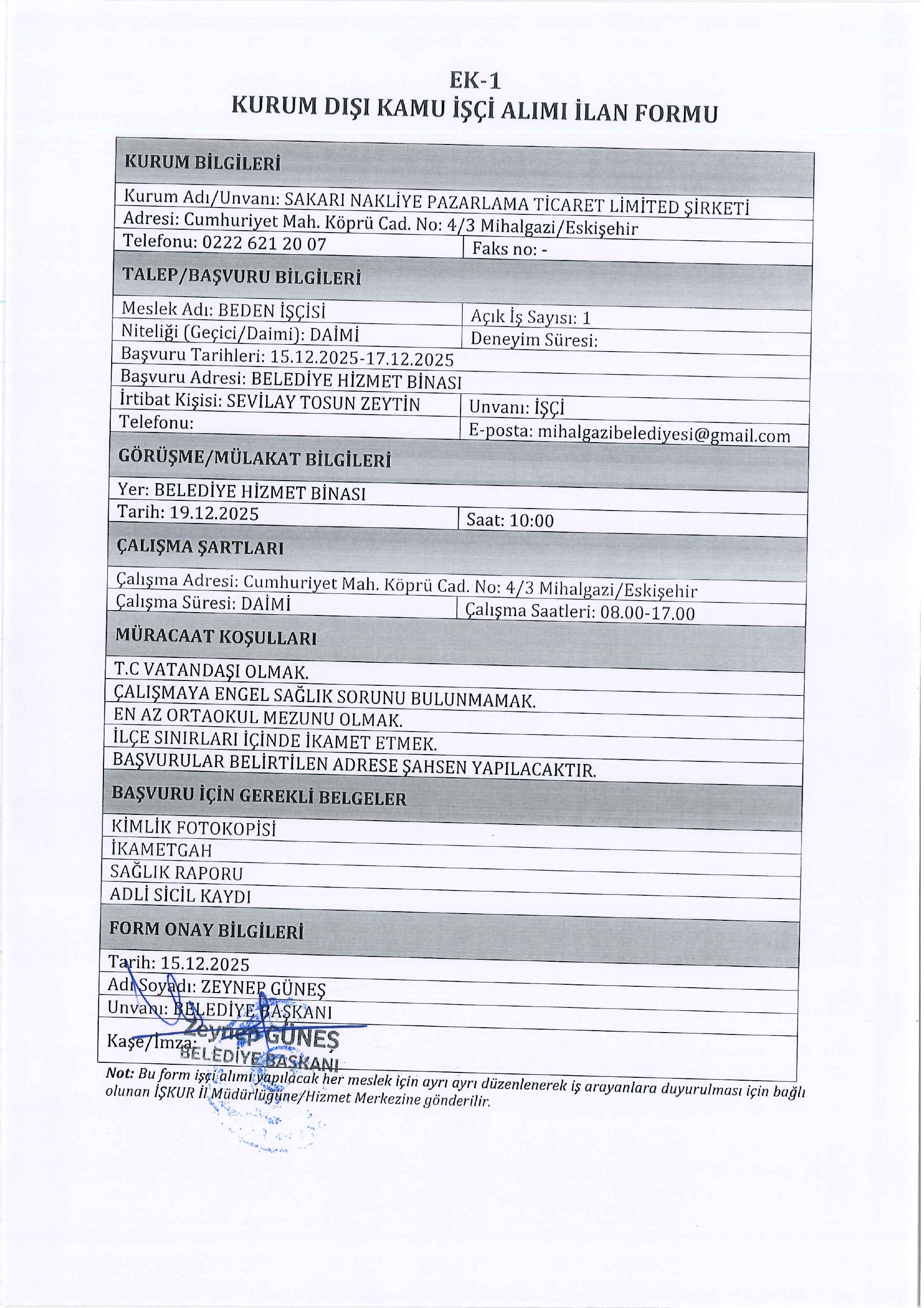 Eskişehir Sakari Nakliye 1 Personel Alacak. Son müracaat tarihi 17 Aralık 2025
