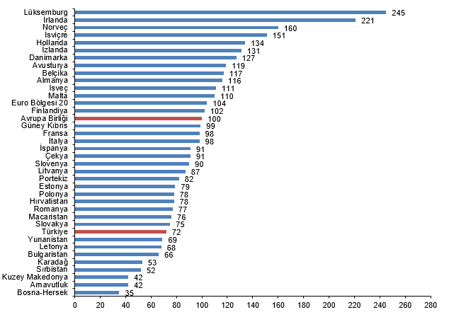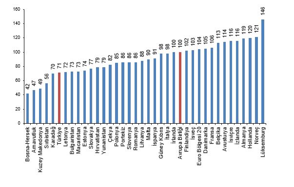 Kişi başına fiili kişisel tüketim düzeyi 27 Avrupa Birliği ülkesi ortalaması 100 iken, Türkiye için 71 oldu ve AB ortalamasının %29 altında kaldı. Karşılaştırmalarda yer alan 36 ülke ortasında kişi başına fiili ferdî tüketim kıymeti en yüksek ülke 146 ile Lüksemburg, en düşük ülke ise 42 ile Bosna-Hersek oldu.