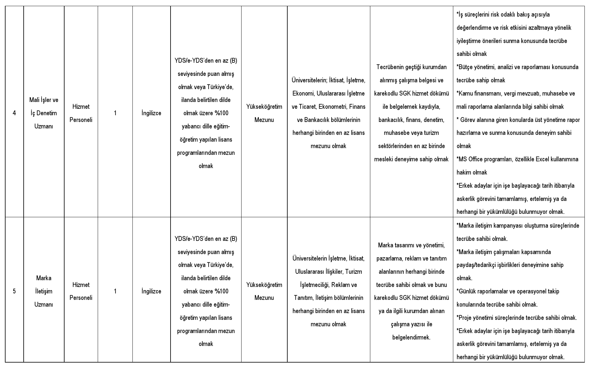 30.01.2024 tarihli ve 32445 sayılı Türkiye Turizm Tanıtım ve Geliştirme Ajansı Çalışanının Vazife, Yetki ve Sorumlulukları İle İşe Alınmalarına Ait Metot ve Asıllar Hakkında Yönetmelik kararları uyarınca; başvuracak adaylarda aranılan nitelikler ile 30.01.2024 tarihli ve 32445 sayılı Türkiye Turizm Tanıtım Ve Geliştirme Ajansı Çalışanının Vazife, Yetki Ve Sorumlulukları İle İşe Alınmalarına Ait Yordam Ve Temeller Hakkında Yönetmelik’in 11. unsurundaki genel koşullar ve ilan edilen durum için belirtilen özel koşullar;