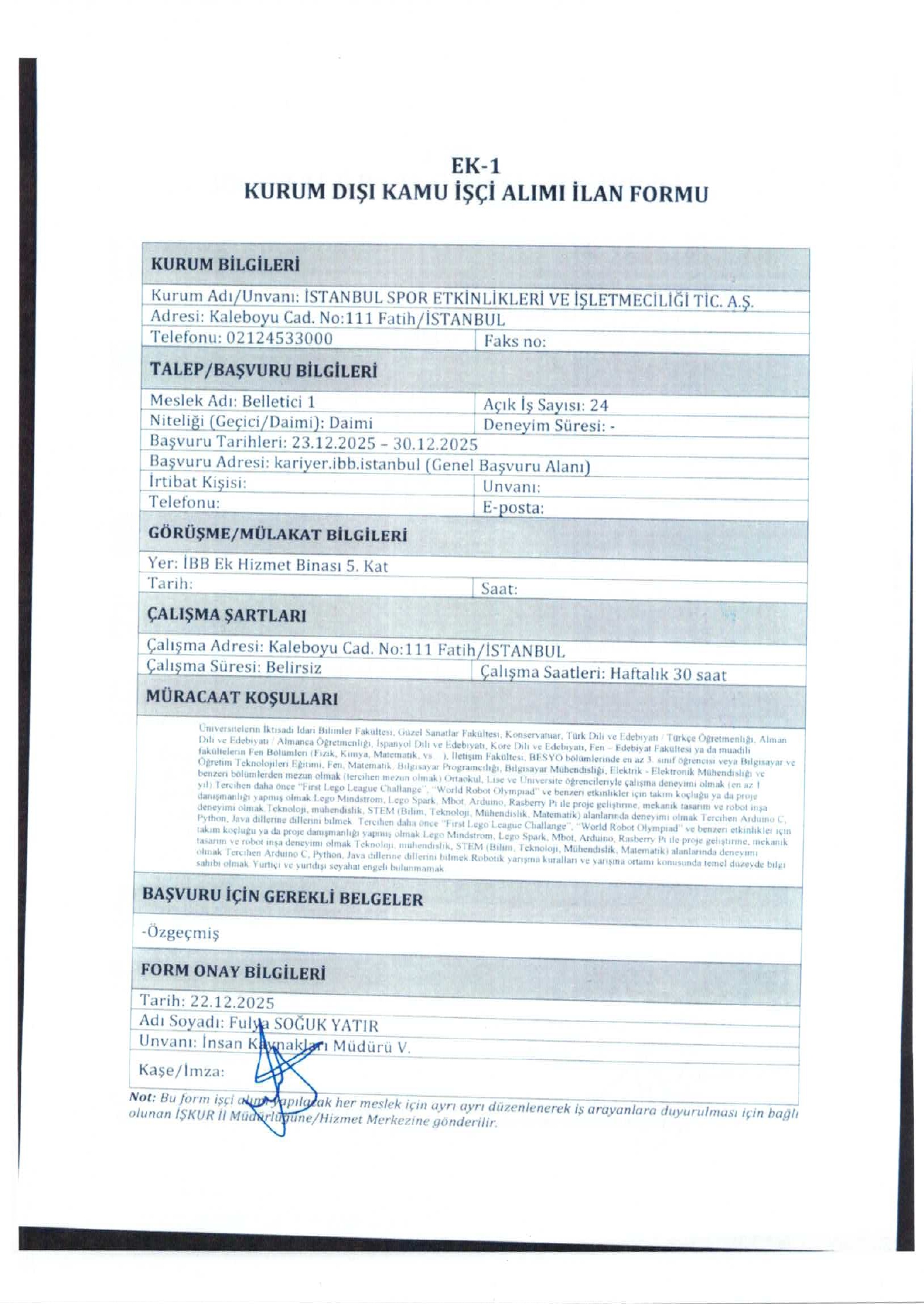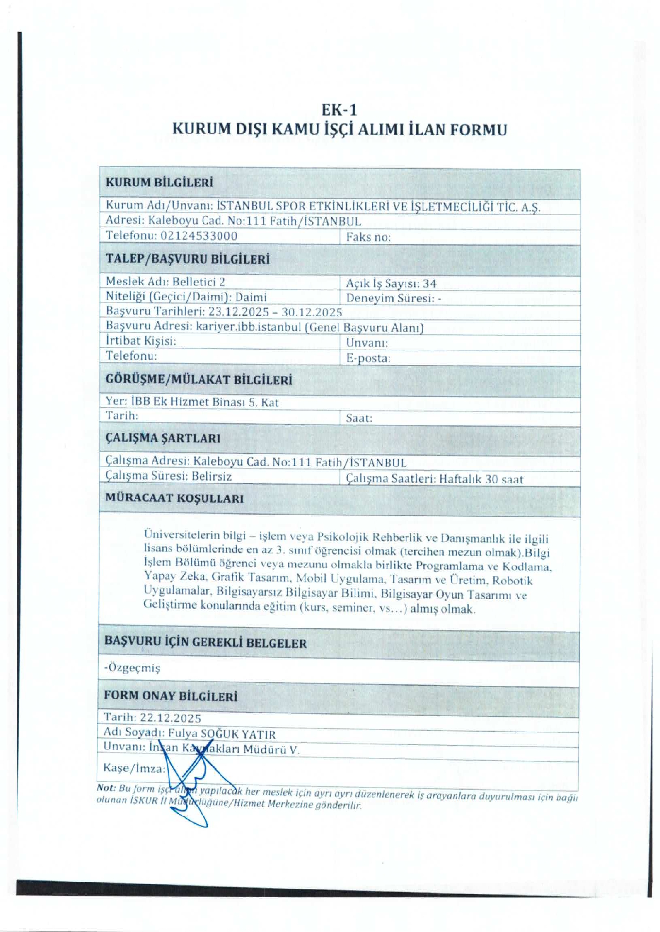 İstanbul Spor Aktiflikleri 58 Emekçi Alacak. Son müracaat tarihi 30 Aralık 2025