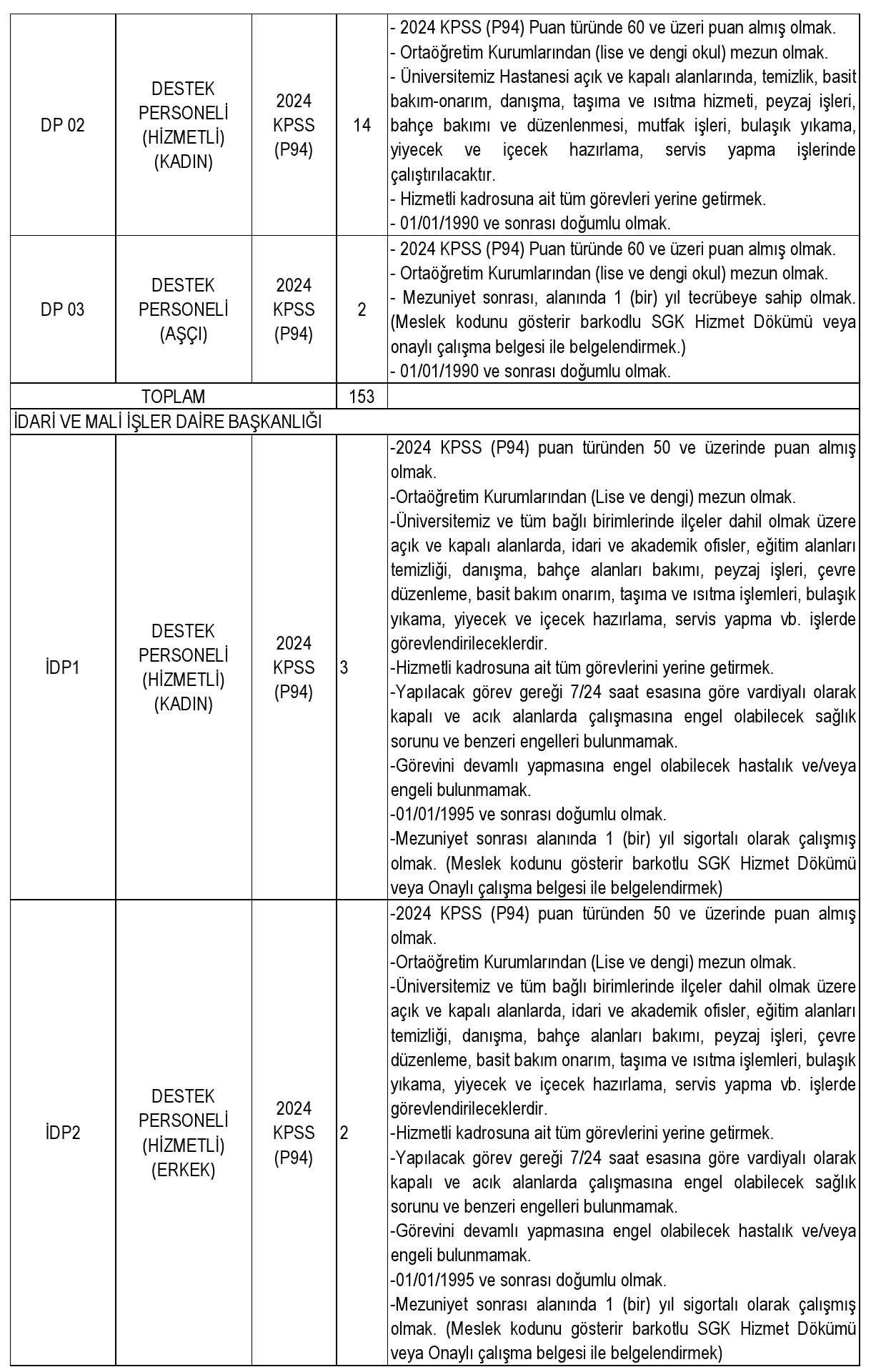 657 sayılı Devlet Memurları Kanununun 4 üncü unsurunun (B) fıkrası uyarınca istihdam edilmek üzere, 06/06/1978 tarihli ve 7/15754 sayılı Bakanlar Kurulu Kararı ile yürürlüğe konulan Kontratlı İşçi Çalıştırılmasına Ait Asılların Ek 2 nci unsurunun (b) fıkrası yeterince yazılı ve/veya kelamlı imtihan yapılmaksızın, 2024 KPSS (B) kümesi puan sıralaması temel alınmak suretiyle aşağıda belirtilen konumlara toplam 162 (yüzaltmışiki) adet kontratlı işçi alınacaktır.