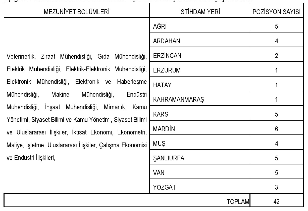 Tarım ve Kırsal Kalkınmayı Destekleme Kurumu merkez ve taşra teşkilatında çalıştırılmak üzere 375 sayılı Kanun Kararında Kararnamenin ek 27 inci unsuru ile 20/01/2021 tarih ve 31370 sayılı Resmi Gazetede yayımlanan Tarım ve Kırsal Kalkınmayı Destekleme Kurumu İşçi Yönetmeliğinin 6 ila 15 inci hususları kararlarına nazaran açıktan atama yoluyla 42 uzman kontratlı işçi alımı için yazılı ve sözlü olarak seçme sınavı yapılacaktır.