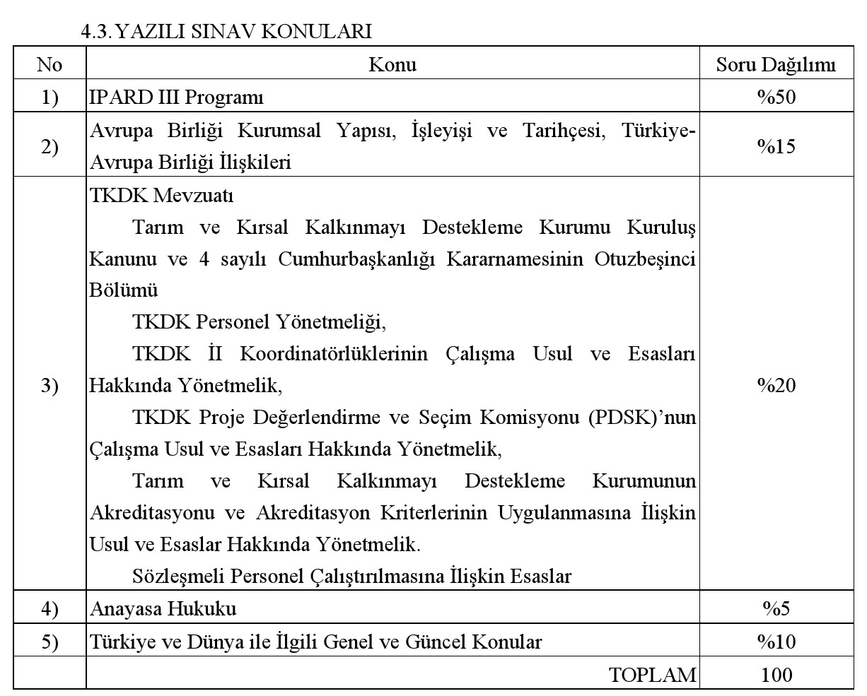 1) Kelamlı imtihan Tarım ve Kırsal Kalkınmayı Destekleme Kurumu tarafından yapılacak olup, yazılı imtihanda başarılı olan adayların kelamlı imtihan tarihi ve yeri www.tkdk.gov.tr internet adresinden duyurulacaktır.