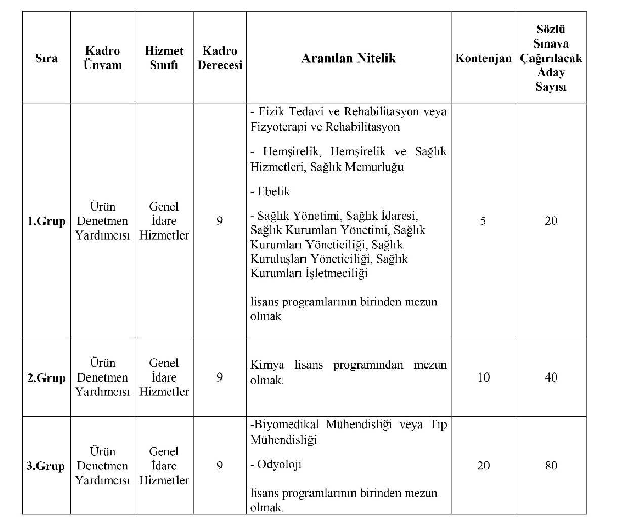 Türkiye ilaç ve Tıbbi Cihaz Kurumu Kontrol Hizmetleri Lider Yardımcılığı hizmet ünitelerinde (Merkez Teşkilat, İstanbul ve İzmir Kontrol Grubu) çalıştırılmak üzere 35 Eser Denetmen Yardımcısı alınacaktır.