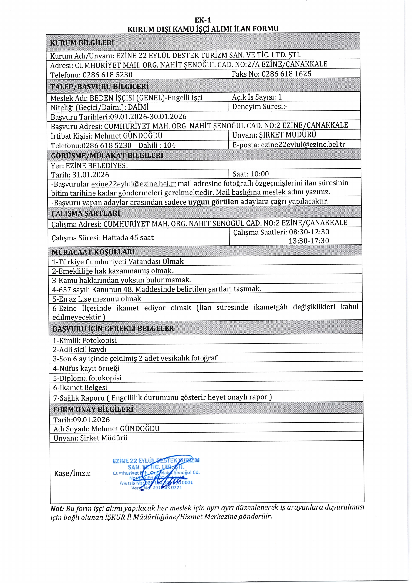 Çanakkale Ezine 22 Eylül Dayanak Turizm 1 Personel Alacak. Son müracaat tarihi 30 Ocak 2026