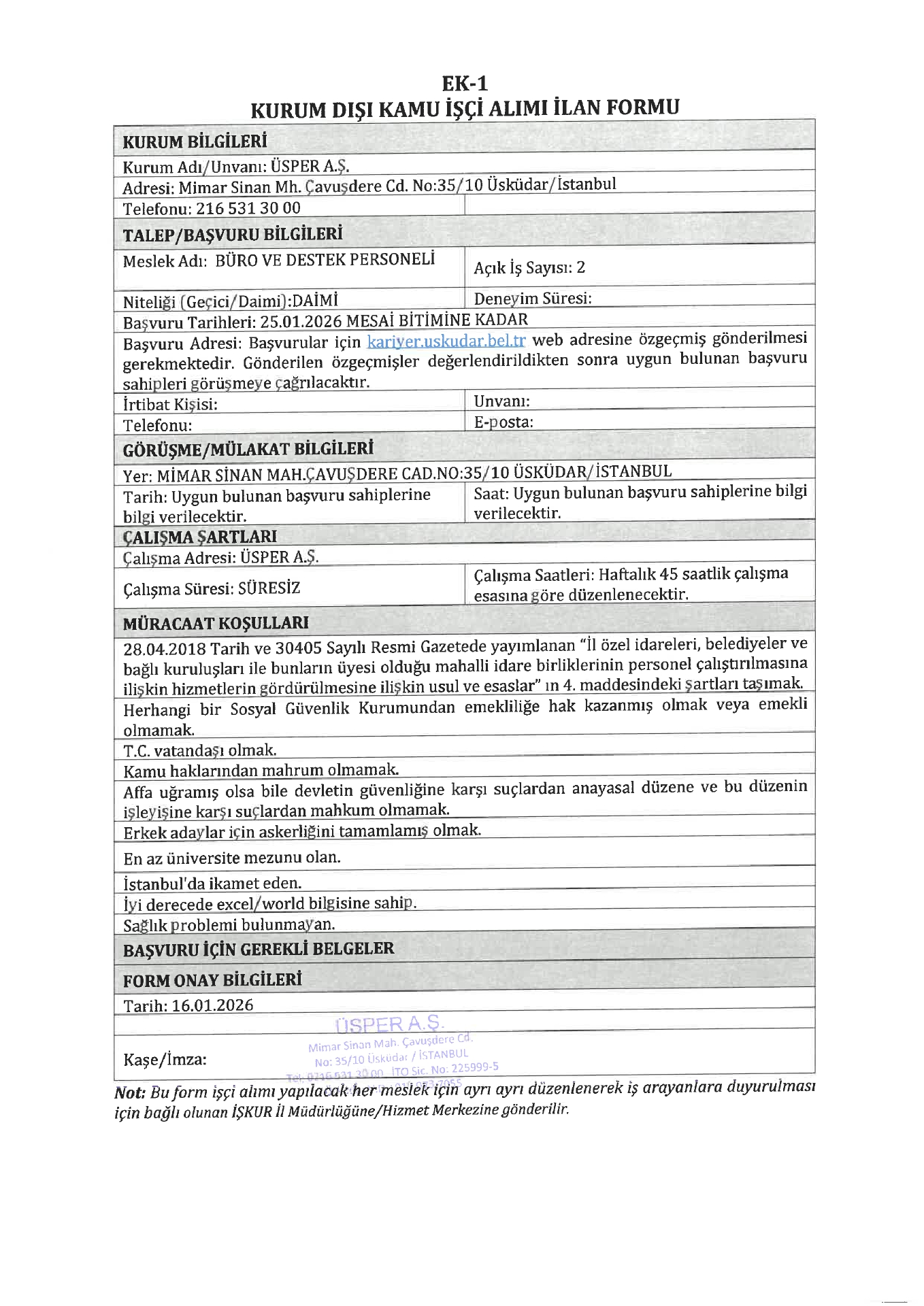 Üsküdar Üsper 3 Personel Alacak. Son müracaat tarihi 25 Ocak 2026