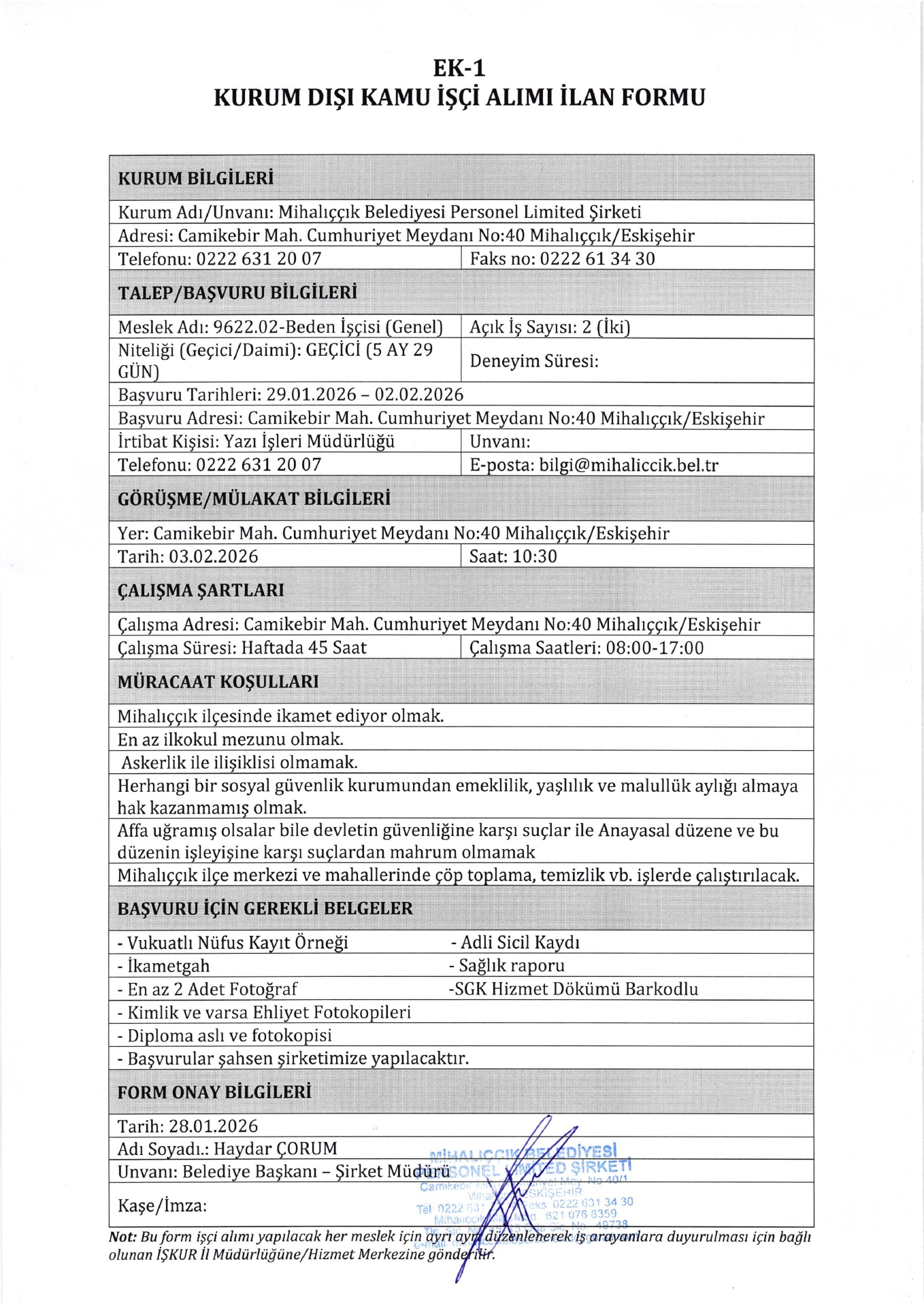 Eskişehir Mihalıççık Belediyesi Süreksiz 2 Emekçi Alacak. Son müracaat tarihi 2 Şubat 2026
