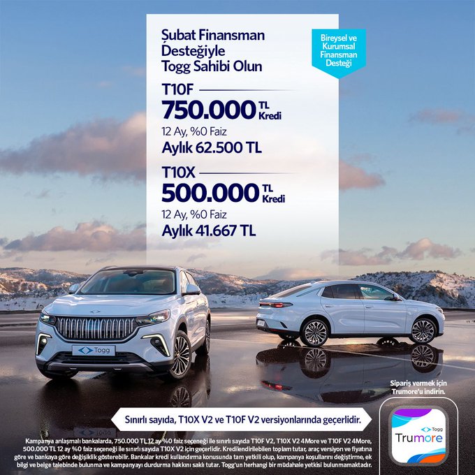 Buna nazaran kişisel ve kurumsal kullanıcılar, T10F V2 ile T10X ve T10F 4More versiyonlarına 750 bin lira fiyatında, yüzde sıfır faizli ve 12 ay vadeli kredi imkanıyla sahip olabiliyor.