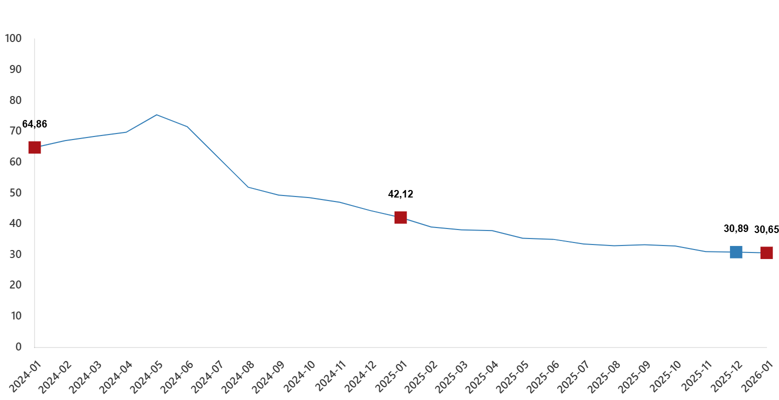 TÜFE’deki (2025=100) değişim 2026 yılı Ocak ayında bir evvelki aya nazaran %4,84 artış, bir evvelki yılın Aralık ayına nazaran %4,84 artış, bir evvelki yılın birebir ayına nazaran %30,65 artış ve on iki aylık ortalamalara nazaran %33,98 artış olarak gerçekleşti.