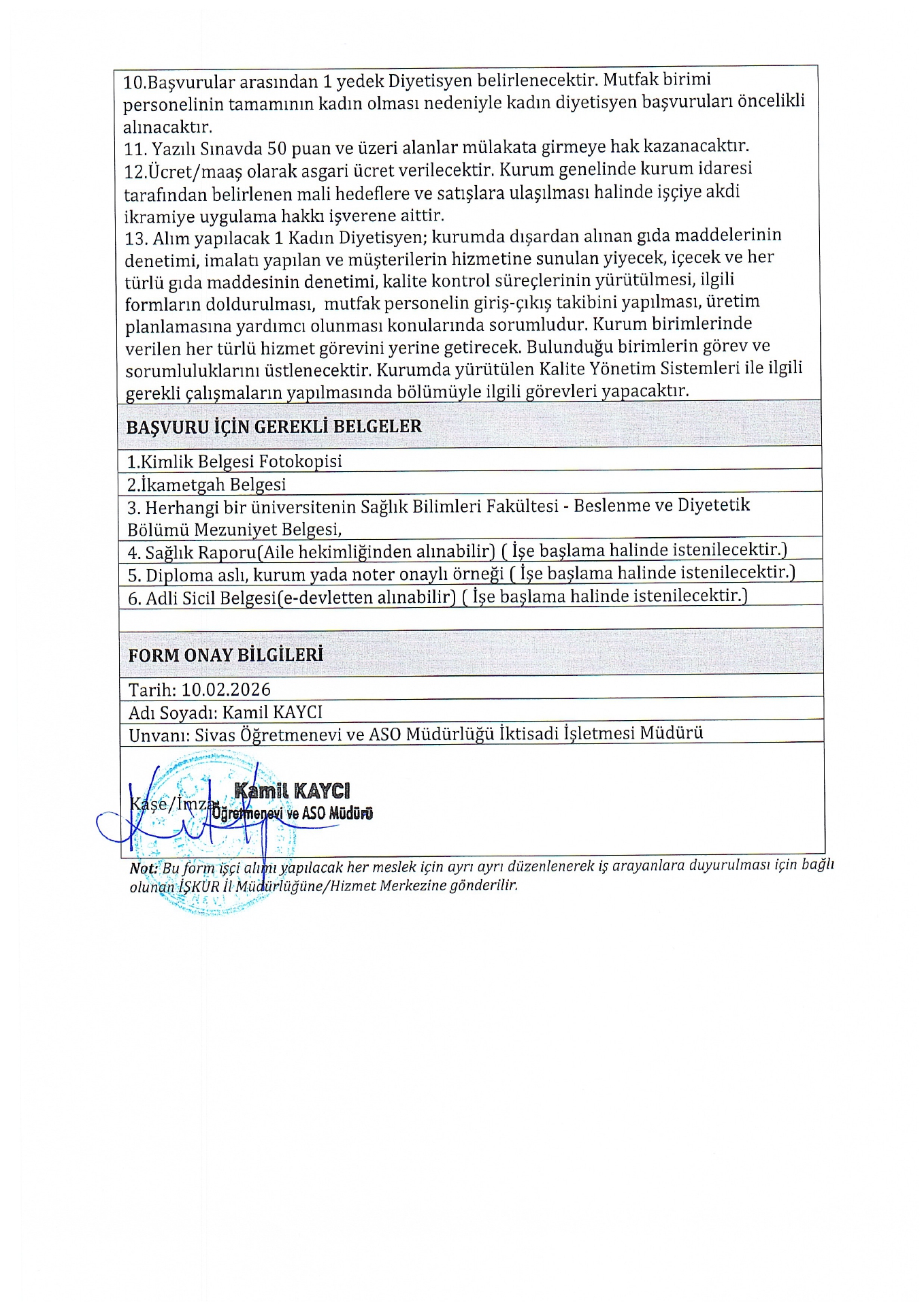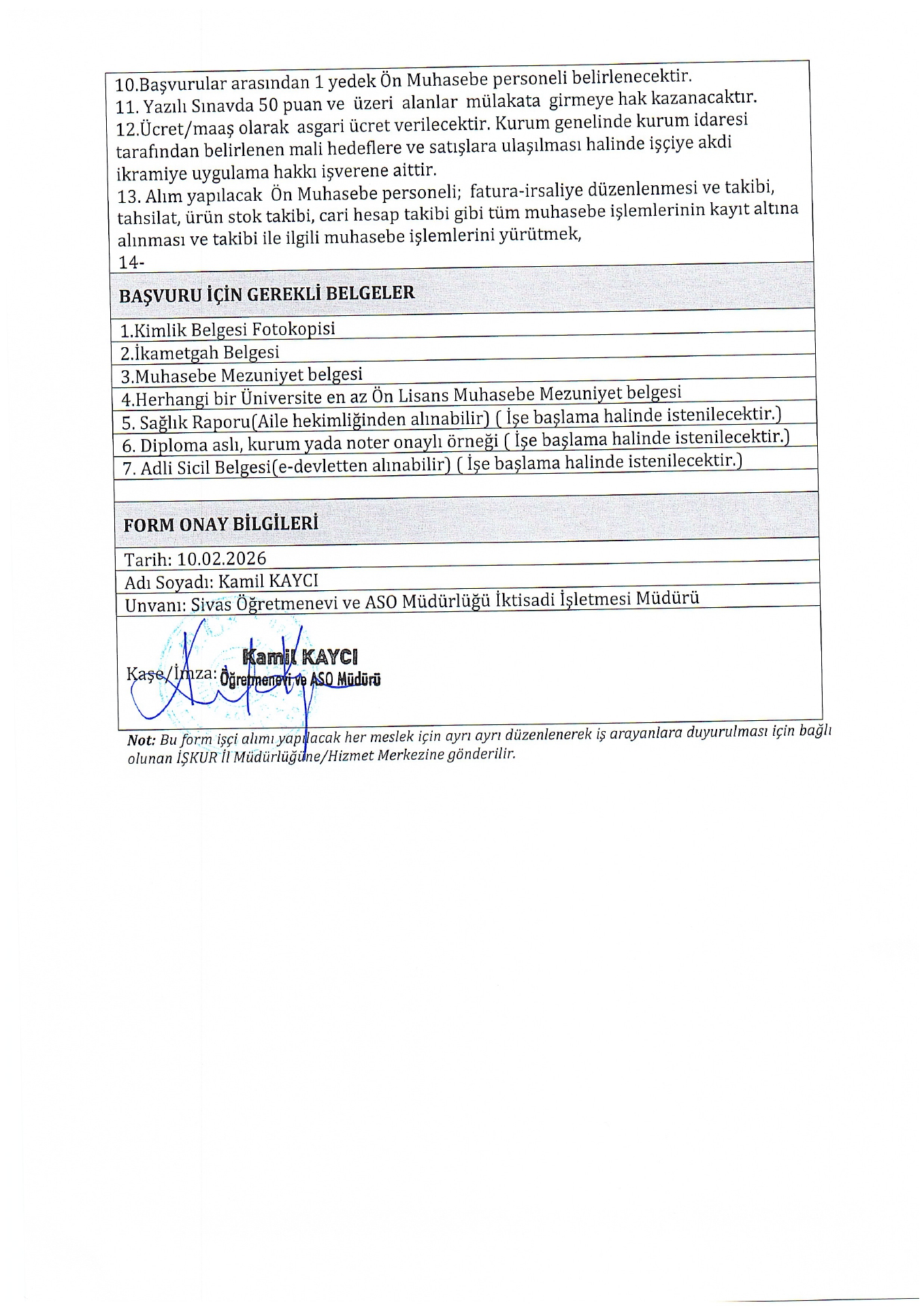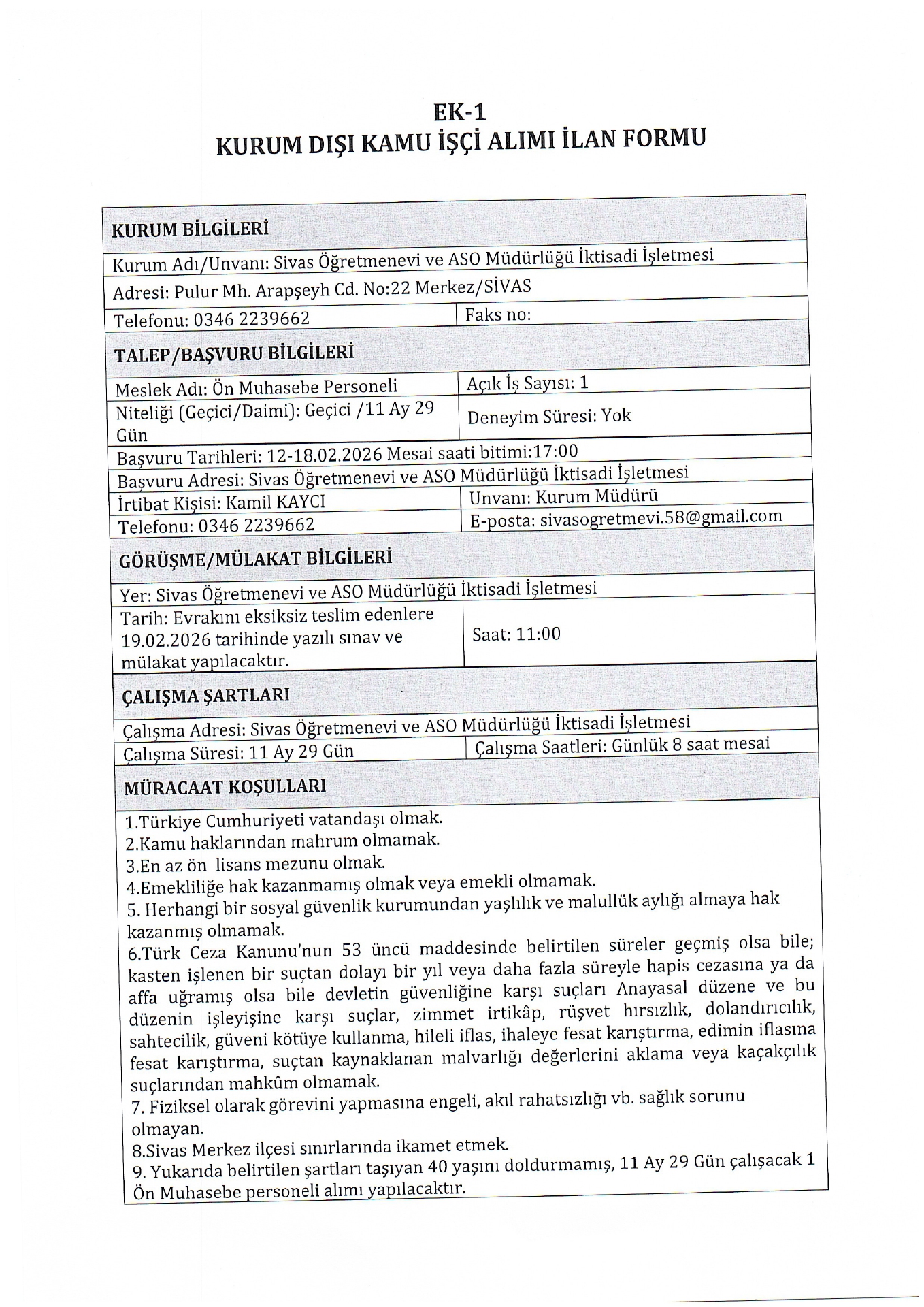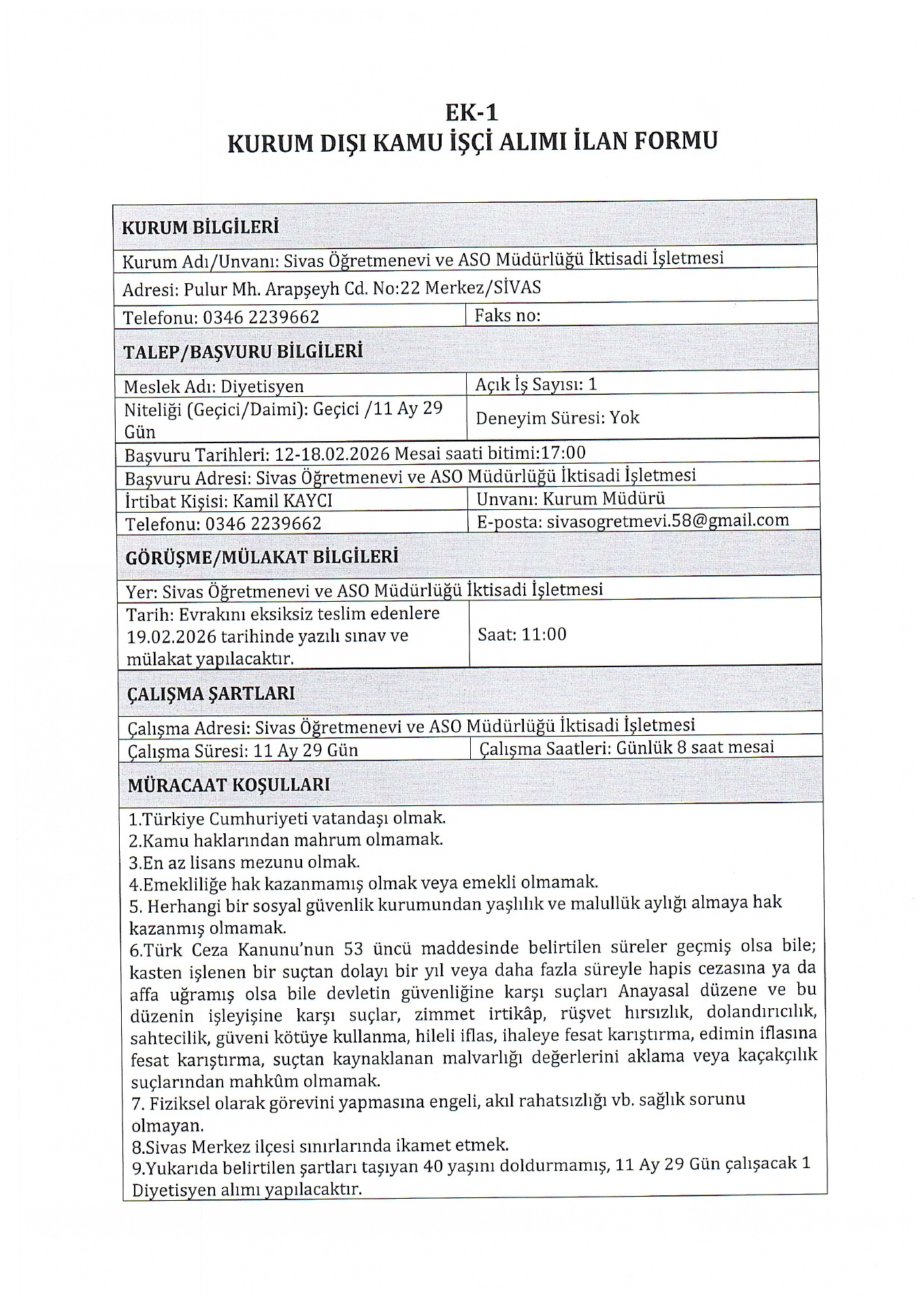 Sivas Öğretmenevi Süreksiz 1 Emekçi Alacak. Son müracaat tarihi 18 Şubat 2026