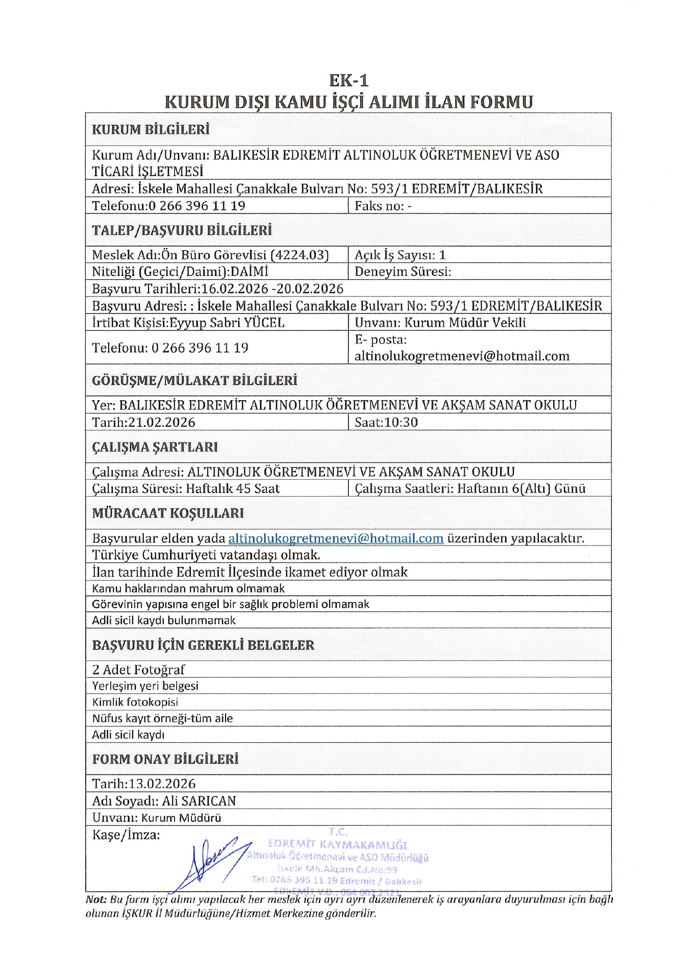 Balıkesir Altınoluk Öğretmenevi 3 Personel Alacak. Son müracaat tarihi 20 Şubat 2026