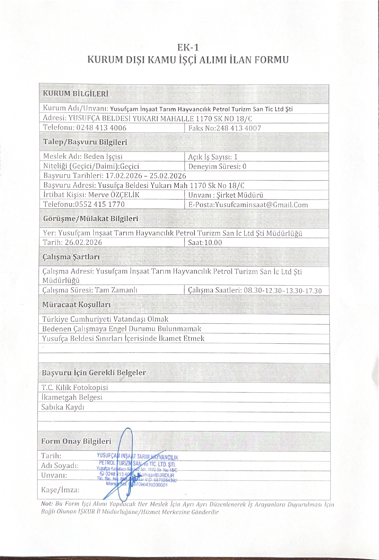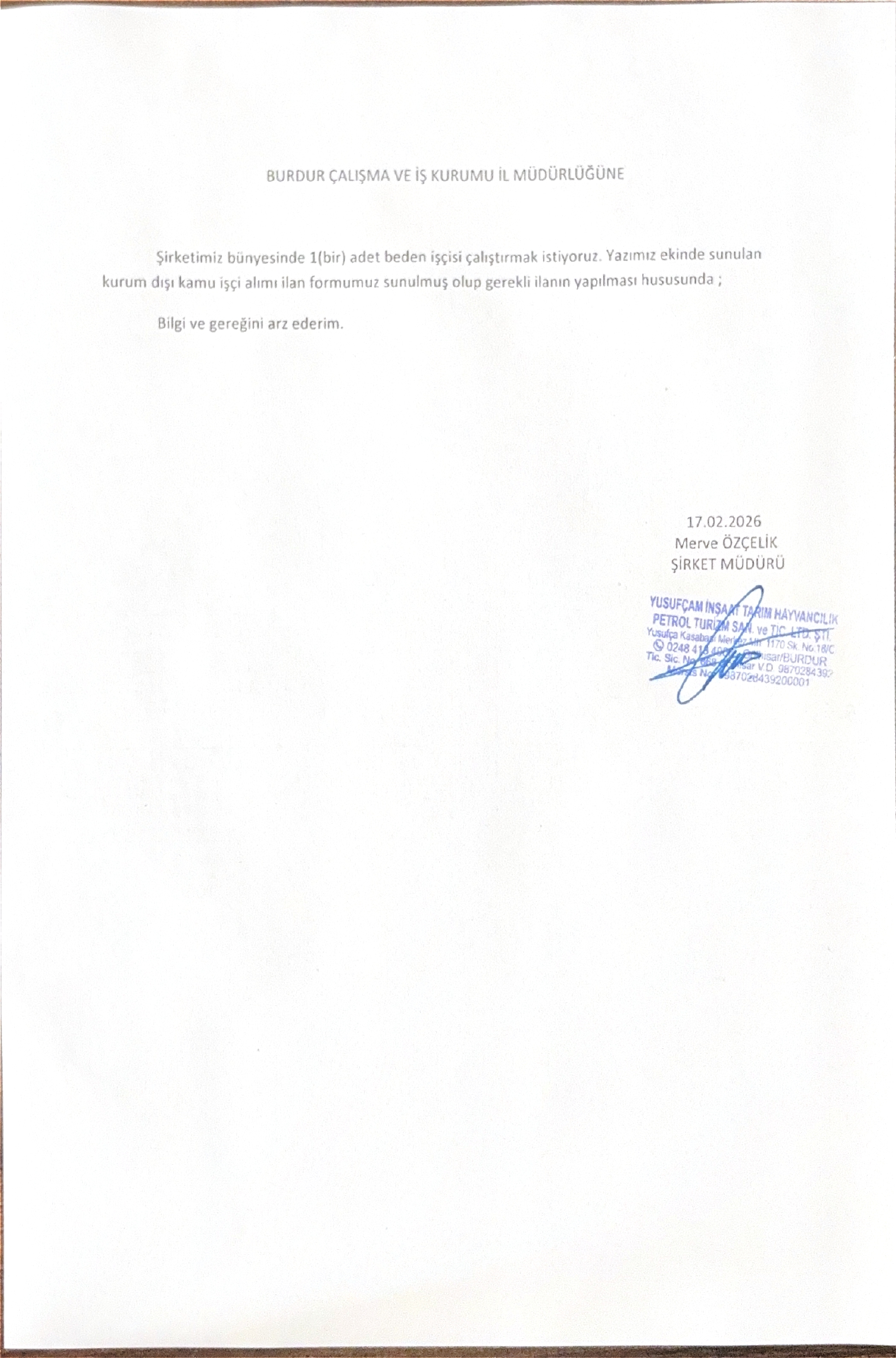 Burdur Yusufçam İnşaat Süreksiz 1 Personel Alacak. Son müracaat tarihi 25 Şubat 2026