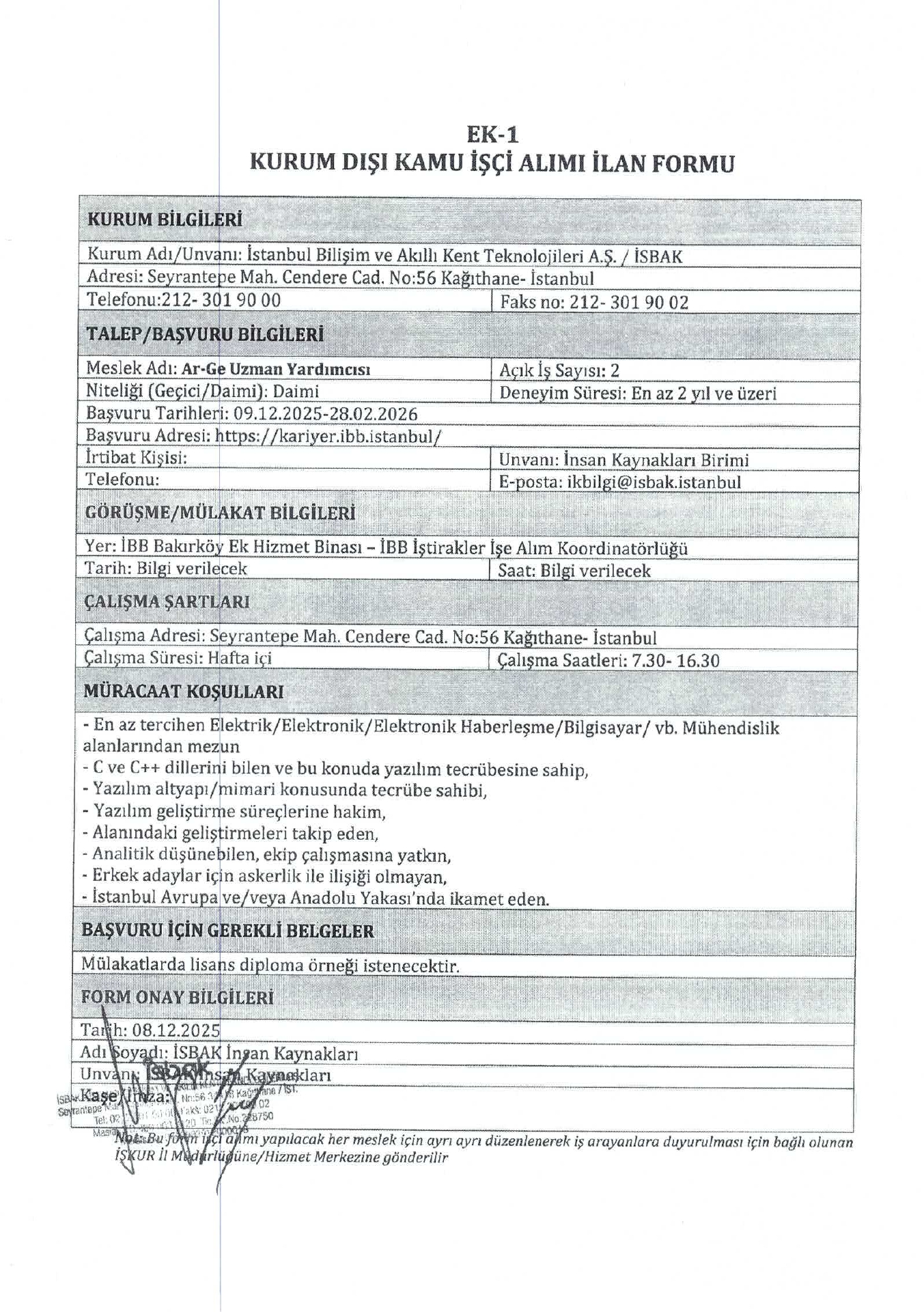 İstanbul Bilişim Akıllı Kent Teknolojileri 2 Emekçi Alacak. Son müracaat tarihi 28 Şubat 2026