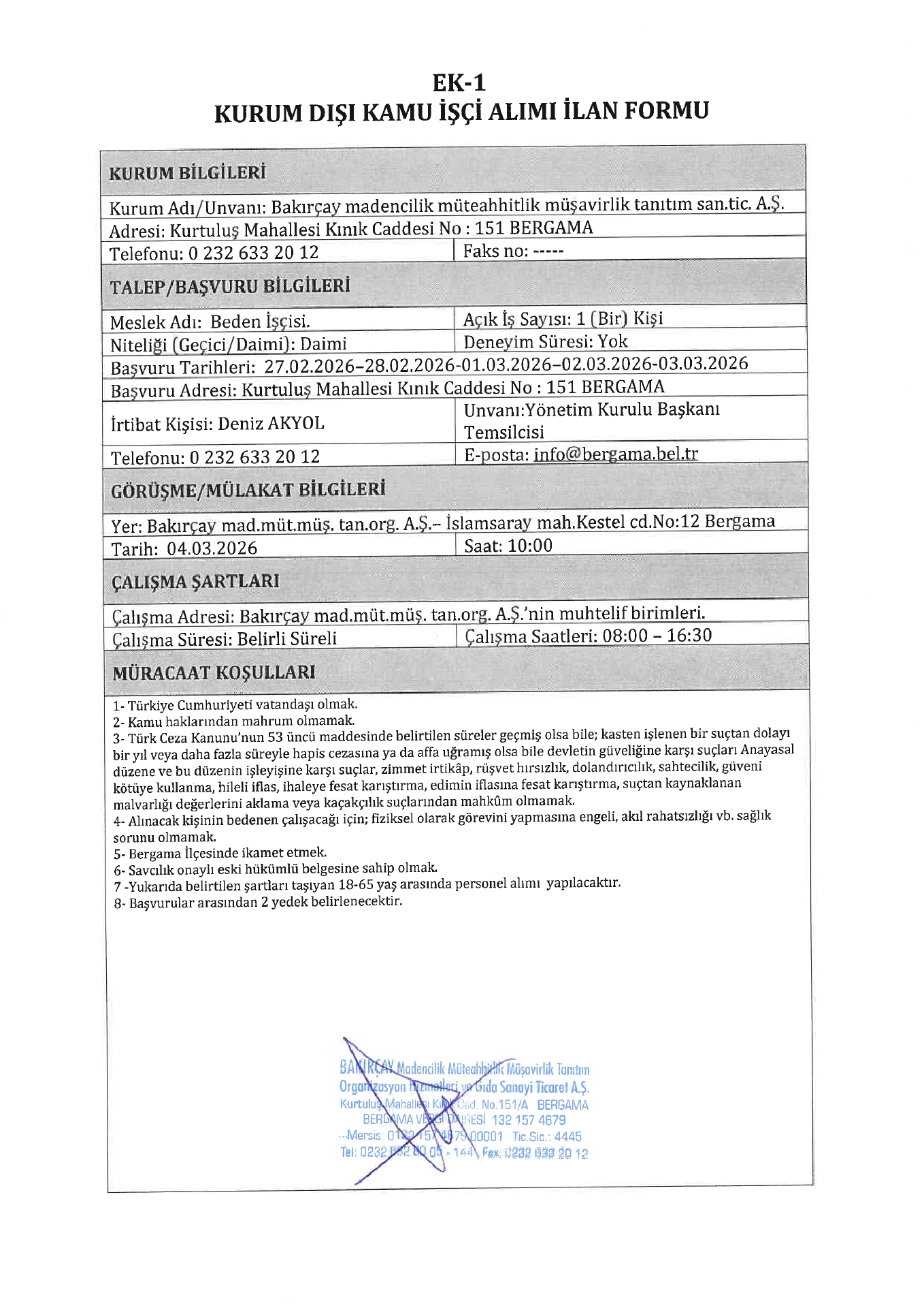 İzmir Bakırçay Madencilik 1 Personel Alacak. Son müracaat tarihi 3 Mart 2026