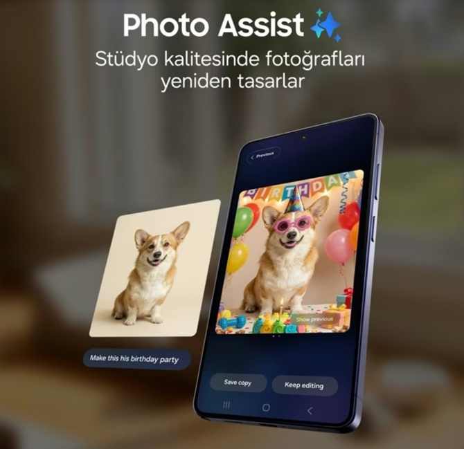 Galaxy S26 Ultra’da Galaxy AI, kullanıcı tecrübesini hem yaratıcı hem de fonksiyonel açıdan bir üst düzeye taşıyor. Photo Assist özelliği sayesinde, kullanıcılar sırf birkaç söz ile fotoğraflarını stüdyo kalitesinde düzenleyebiliyor. Örneğin, bir köpeğin fotoğrafına “Bunu onun doğum günü partisi yap” üzere bir komut girildiğinde, Galaxy AI otomatik olarak fotoğraf üzerine aksesuarlar ve temalar ekleyerek görseli dönüştürüyor.