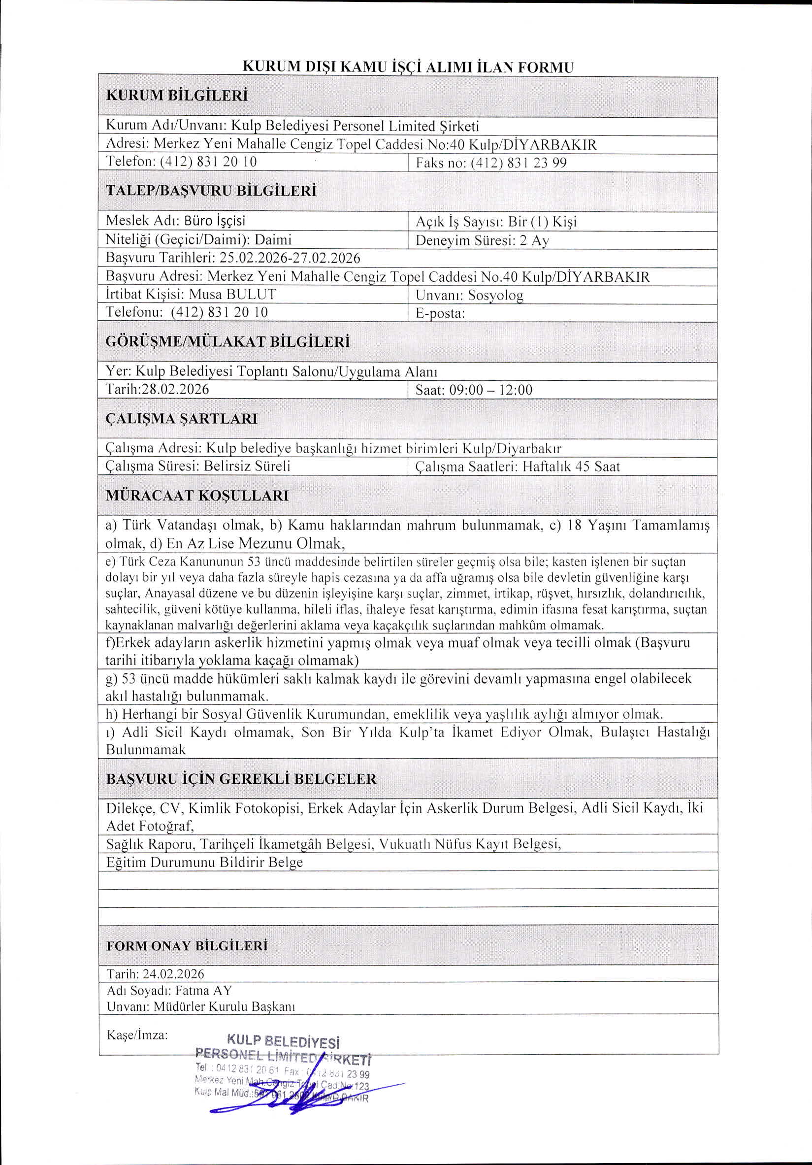 Diyarbakır Kulp Belediyesi Süreksiz 1 Emekçi Alacak. Son müracaat tarihi 27 Şubat 2026