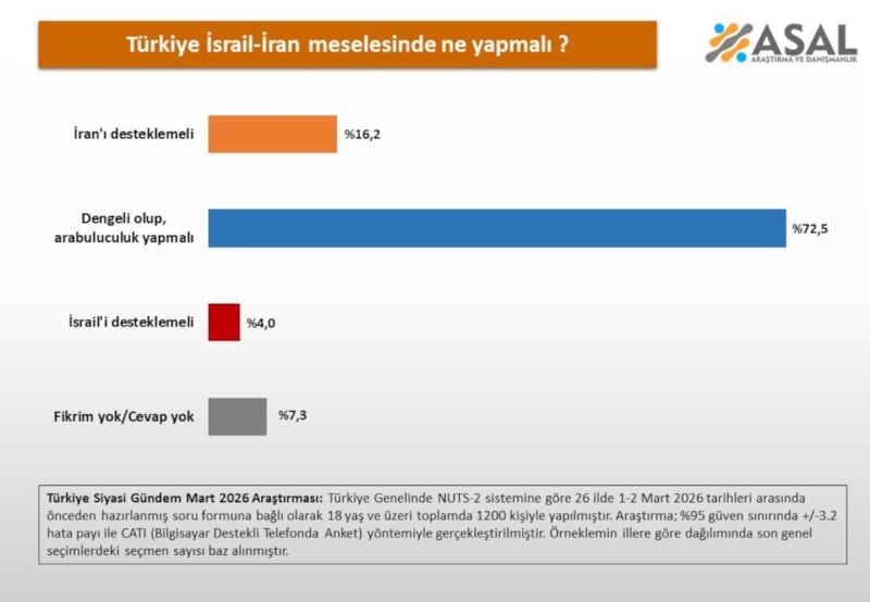 Asal Araştırma, 1-2 Mart tarihleri ortasında yaptığı çalışmada, bin 200 kişiye “Türkiye İsrail-İran probleminde ne yapmalı?” sorusunu yöneltti.