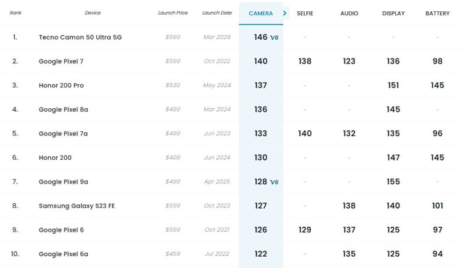 Şirkete nazaran CAMON 50 Ultra 5G, kamera performansı değerlendirmeleri yapan DXOMARK testlerinde 146 genel kamera puanı elde etti. Bu sonucun 600 dolar altı fiyat segmentindeki akıllı telefonlar ortasında en yüksek skor olduğu tabir ediliyor. Ayrıyeten aygıtın portre fotoğrafçılığı kategorisinde 142 puan aldığı da belirtiliyor.